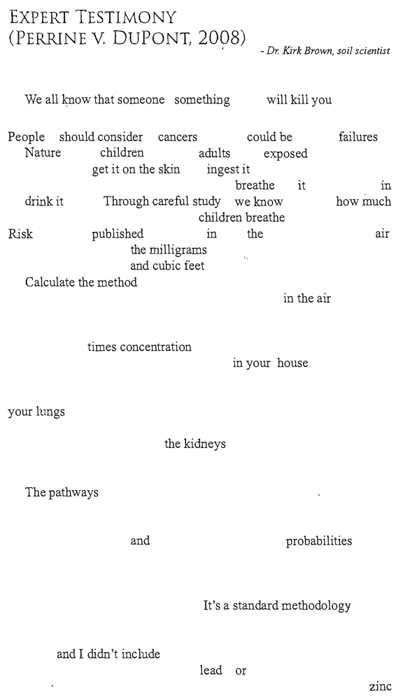 In fewer than 100 words, this poem crystallizes Dr. Brown’s actual testimony, which is far more defuse and equivocal. The witness’s statement about the increased risk of cancer is translated from numerical probabilities into biological activities (“get it on the skin,” “ingest it,” etc.) as a way of vivifying the pathways of contamination and enhancing readers’ empathy for victims of dangerous contamination.