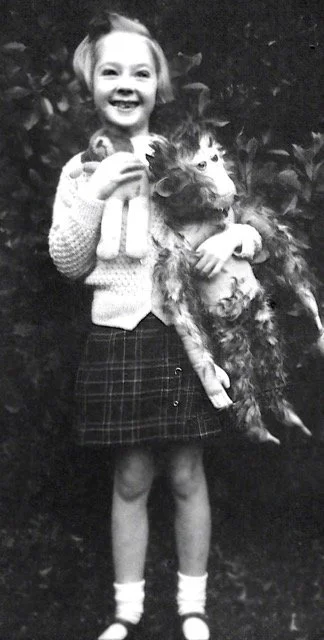 Jane as a little girl, hugging her toy chimpanzee, Jubilee