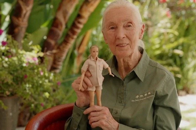 In 2022, Mattel honored Jane Goodall with her own Barbie doll, part of the Inspiring Women series. The doll depicts her in her Gombe field outfit, binoculars in hand, alongside a model of David Greybeard, the first chimpanzee who trusted her.
